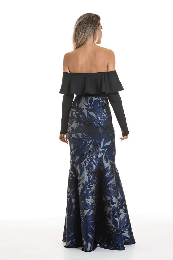 Apresentamos o vestido longo de festa Camila Siqueira alta costura em crepe acetinado preto, um modelo que combina sofisticação e elegância. Com um deslumbrante ombro a ombro de babado, este vestido possui manga longa que traz um toque de charme e classe.