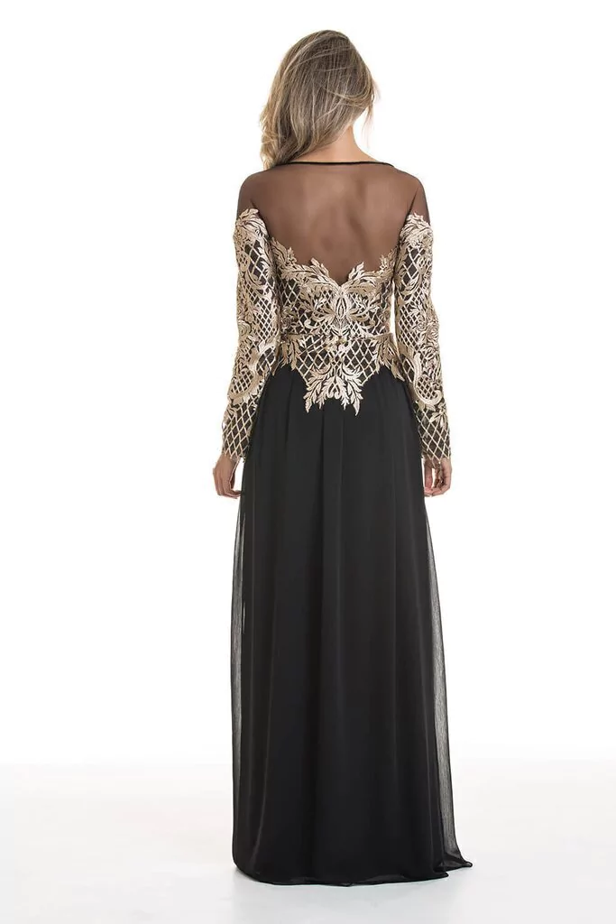 Vestido longo alta costura, fluído, corpo no tecido tule bordado arabesco dourado com mangas longas, gola canoa bordada de canutilhos pretos e decote coração frontal, saia rodada no tecido musseline, fechamento na lateral esquerda por zíper invisível.